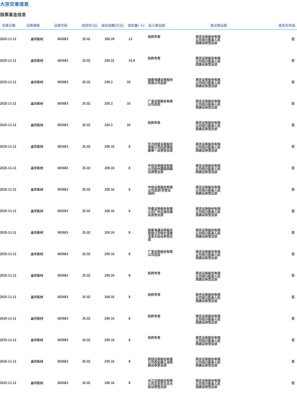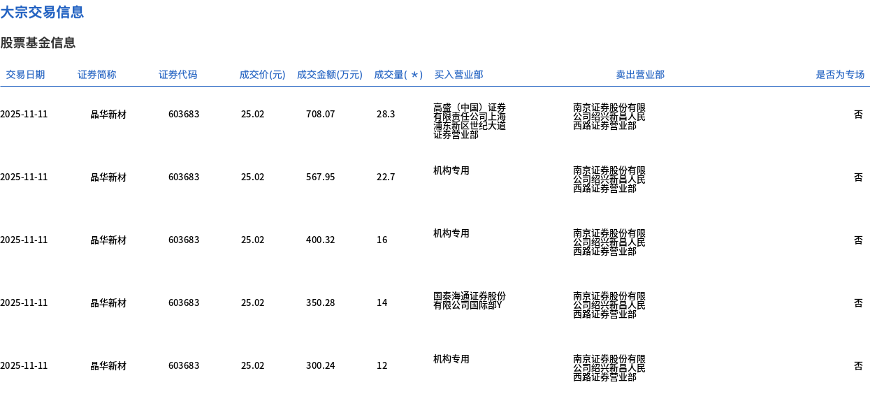 11月11日,晶华新材大宗交易成交241.4万股,成交额6039.83万元,占当日总成交额的13.49%,成交价25.02元,较市场收盘价30.58元折价18.18%。